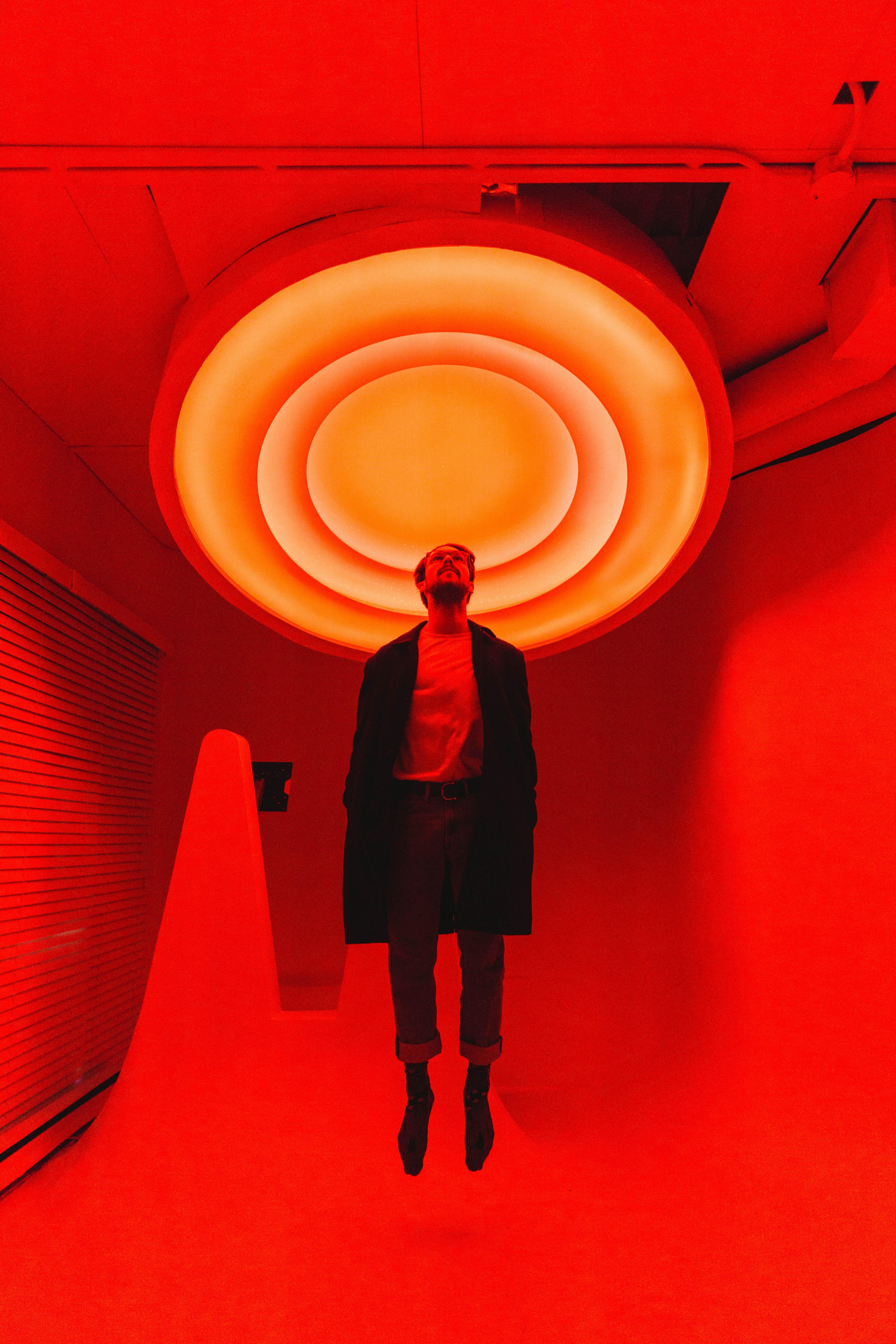 Man Standing Under Large Red Light Inside Room Photo Free Image On Unsplash